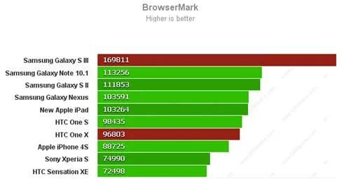 معیارسنج BrowserMark افزونهی HTML را بهطور مساوی اضافه میکند در پشت صحنه جاوا اسکریت اگر صفحات اینترنتی دارای حرکت سریع و روانی نباشند نمیتواند نقشی ایفا کند. Galaxy S III رتبهی اول را در این معیار بهدست آورد و نشان داد که در این باره بسیار راحتتر عمل میکند با برتری 7.5 در صدی نسبت به One X.