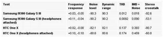 تمام خصوصیات این دو گوشی زمانی که به هدفون متصل میشوند به یکدیگر نزدیکتر میشود در بیشتر قسمتهای آزمایش هنوز Galaxy S III بهتر عمل میکند اما One X تصمیم دارد در نهایت با تداخل کمتر صدای استریو نتیجهی بهتری را به دست آورد اگر چه این نمیتواند برای جلوگیری از قرار دادن پرچمدار سامسونگ به عنوان یک دستگاه مورد علاقه کافی باشد.