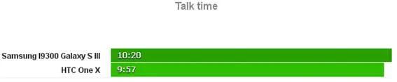 چیپ ست 4 هستهای و صفحه نمایش HD که در حدود 4 اینچ یا بزرگتر هستند در کل برای عمر باطری خوب نمیباشند اما مدعیان ما به خوبی خود را آماده کردهاند HTC One X با یک باطری تقریباً پر ظرفیت 1800 میلیآمپری مجهز شده است در حالی Galaxy S III با یک باطری تحسین برانگیزتر 2100 آمپری تجهیز شده است ما به شدت دنبال این موضوع هستیم که بیابیم که آیا 300 میلی آمپر بیشتر در Galaxy S III میتواند صفحه نمایش کمی بزرگتر و نبود هستهی کم مصرف موجود در CPU آن را جبران کند به طور معمول ما با مدت زمان مکالمه در شبکهی 3G شروع کردیم و مشاهده کردیم که هر دو رقیب کارآیی خوبی را نشان دادند با صفحات پر مصرف بزرگ هر دو دستگاه خوب ظاهر شدند. مکالمه با One X به مدت 9 ساعت و 57 دقیقه با یک شارژ به طول انجامید در حالی که مکالمه Galaxy S III با زمان غیر قابل باور 10 ساعت و 20 دقیقه طول کشید.