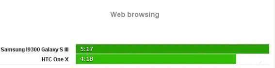 هر دو پرچمدار در آزمایش پایداری باطری در وب گردی کمتر توانستند ما را متقاعد کنند One X تنها 4 ساعت و 18 دقیقه در این آزمایش دوام آورد و Galaxy S III برای 5 ساعت و 17 دقیقه پاسخگو بود ما حقیقتاً متعجب شدیم که Galaxy S III در این جا رتبه نخست را به دست آورد چون میدانیم که صفحات آمولد سازگاری خوبی با صفحات اینترنتی ندارند.