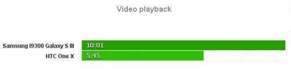 HTC One X در قسمت آزمایشات پخش ویدئوی ما شکست تحقیرآمیزی را تحمل کرد Galaxy S III قدرت بیشتری را برای بهرهوری از استفادهی خوب صفحه نمایش خود در این جا به کار برده است و یک دقیقه بیشتر از 10 ساعت نیاز داشت تا 90 درصد باطری آن خالی شود از طرف دیگر One X در مدت زمان کمتر از 6 ساعت پخش ویدئویی تسلیم شد.