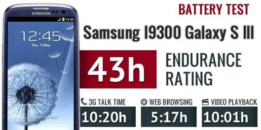تعجب آور نبود که گوشی هوشمند سامسونگ نتیجه را به نفع خود تمام کرد Galaxy S III رتبهی استقامتی 43 ساعت را به دست آورد پیشنهاد میشود که Galaxy S III میتواند با یک بار شارژ مدت زمان 6 ساعت بیشتر را برای شما در مقابل رقیب خود به ارمغان آورد ، اگر شما از آن برای یک ساعت مکالمهی تلفنی، وبگردی و پخش ویدئو در هر روز استفاده نمایید