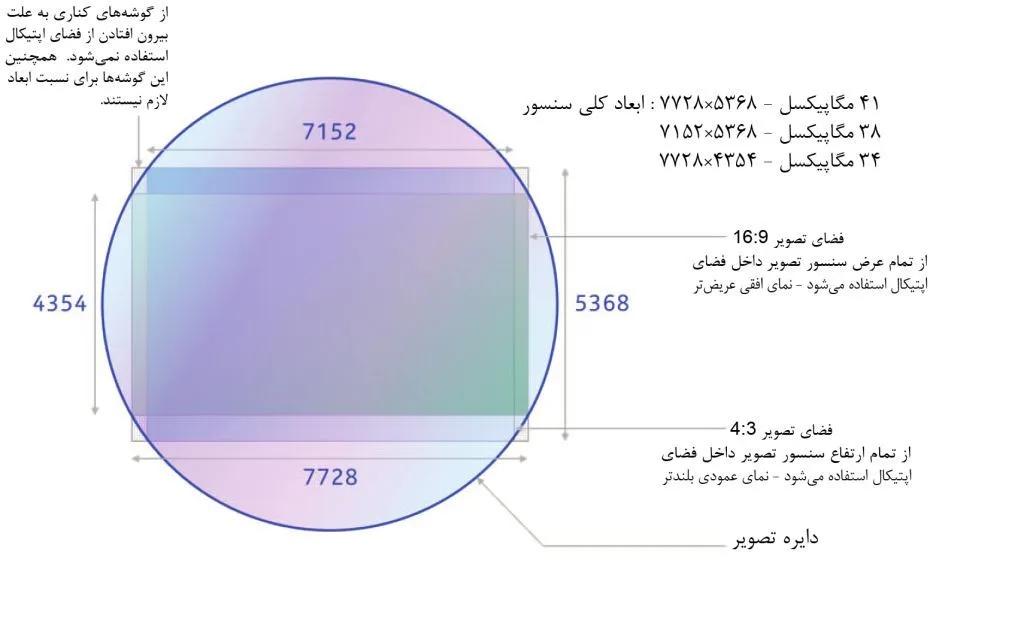 سنسور 41 مگاپیکسلی Nokia 808 واقعا قابل توجه است اما در واقع قادر به عکس برداری با این کیفیت نیست. در این تصویر شما میتوانید نمودهای تصویری متفاوت و رزولوشن های مربوطه را ملاحظه کنید. سنسور این دوربین سطح فعالی معادل 5368×7728 پیکسل دارد اما بسته به نسبت ابعاد انتخابی، برای نسبت 16:9 به میزان 4354×7728 پیکسل و همچنین برای نسبت 4:3 به میزان 5368×7152 پیکسل استفاده میشود.