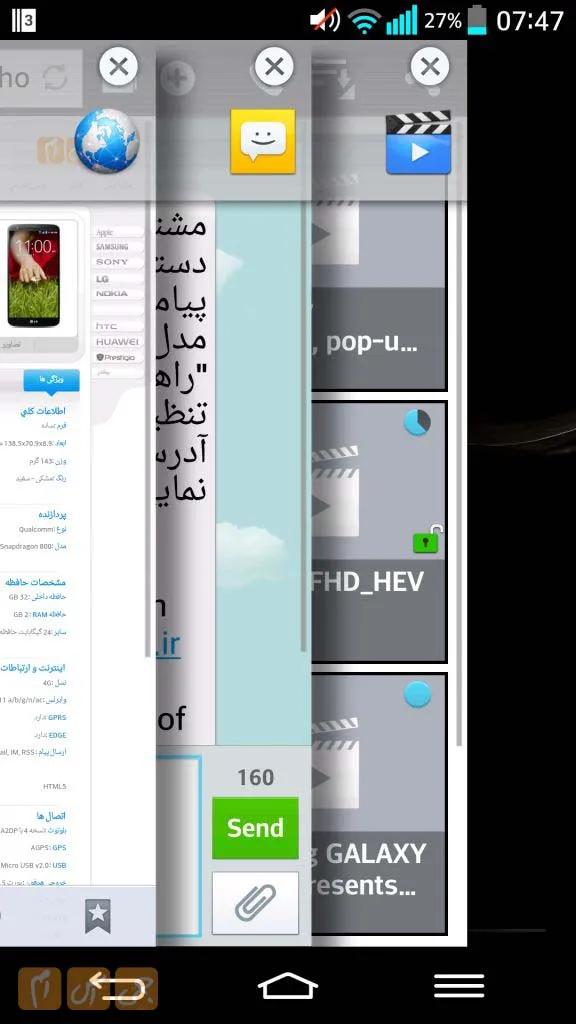 ویژگی جالب دیگر حالت Q Slide است که در بعضی از برنامههای خاص دیده میشود برنامههایی که از این ویژگی پشتیبانی میکنند در بالای خود یک دکمه دارند که با زدن این دکمه صفحه آن اپلیکیشن کوچک میشود و به صفحه اصلی منتقل خواهید شد. بر روی آن صفحه کوچک شده یک شاسی قرار خواهد گرفت که با عقب بردن آن آن صفحه باز کم رنگ تر میشود و میتوانید علاوه بر مشاهده آن صفحه باز شده با گوشی خود کارهای دیگری نیز انجام دهید.