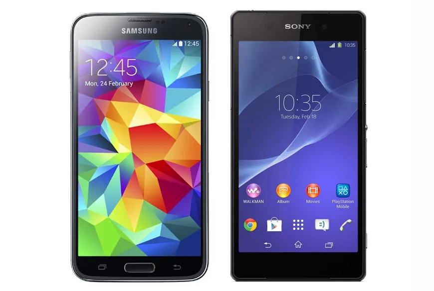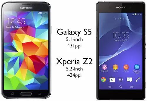 اندازه صفحه نمایش Galaxy S5 برابر با 5.1 اینچ است و در مقابل صفحه نمایش رقیبش 5.2 اینچی است. با این وجود، هر دو صفحه نمایش تصاویر را با رزولوشن Full HD نمایش میدهند و تنها به دلیل اندازه بزرگتر صفحه نمایش Z2، میزان تراکم پیکسلی آن حدود 8 واحد از رقیب خود کمتر است. شرکت سامسونگ در ساخت صفحه نمایش گوشی پرچمدار خود از فناوری AMOLED استفاده کرده است که تصاویر را با رنگهای غلیظ و جزئیات درخشان به نمایش میگذارد. در مقابل، صفحه نمایش Xperia Z2 از نوع IPS Triluminos است و از همان فناوری بهبود تصویر تلویزیونهای Bravia سونی بهره میبرد. به لطف استفاده از فناوری Live Color LED در این صفحه نمایش، تصاویر تولید شده توسط آن رنگ و لعابی جذاب دارند و حتی کمی طبیعیتر از تصاویر Galaxy S5 به نظر میرسند. به طور کلی، صفحه نمایش هر دو گوشی کیفیت تصویری فوقالعاده ای دارند و از نظر شفافیت و وضوح جزئیات بی نظیرند.