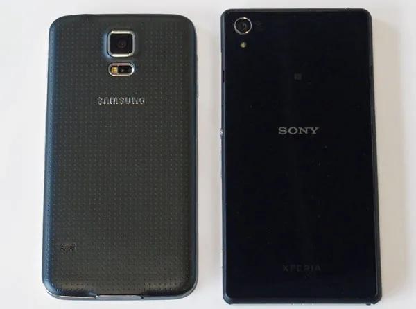 Galaxy S5 از نظر ظاهری شباهتهای زیادی به Galaxy S4 دارد. بدنه این گوشی از جنس پلاستیک ساخته و قاب پشت آن شبیه به طرح پیاده شده روی یک توپ گلف است . ظاهر Xperia Z2 نیز مشابه با Xperia Z1 است. قاب دور این گوشی از جنس آلومینیوم است و دو پوشش شیشهای و مقاوم بر روی پنلهای جلویی و پشتی آن قرار گرفتهاند. ضخامت هر دو گوشی تقریبا برابر با 8.1 میلیمتر است. البته، گوشی Z2 کمی بلندتر و عریضتر از رقیبش است. همچنین، وزن Galaxy S5 برابر با 145 گرم و وزن Xperia Z2 کمی بیشتر و برابر با 163 گرم است.