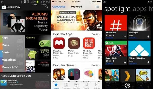 در اینجا ویندوزفون به طور حتم از رقبا جا خواهد ماند، اما بین اندروید و iOS سیستم عامل iOS طبق معمول برای توسعه دهندگان مناسب تر است و نرم افزارها و بازیهای به طور معمول ابتدا برای این سیستم عامل ارائه میشوند. اخیرا گوگل به تازگی توانسته به خوبی گوگل پلی را راه بیاندازد اما از نظر تنوع و کیفیت باید در این قسمت کلاه خود را به احترام iOS برداریم.