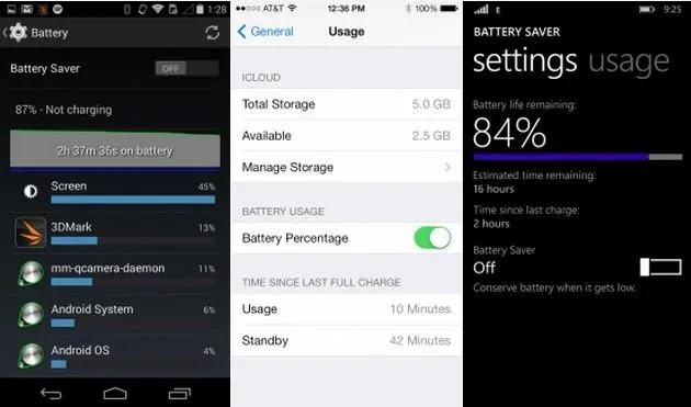 یکی از مهمترین دغدغههای کاربران موبایلی عمر باتری است. مقایسه سه سیستم عامل در این زمینه کار سختی است زیرا هر یک از این سیستم عاملها از سخت افزارهای متفاوتی استفاده میکنند.