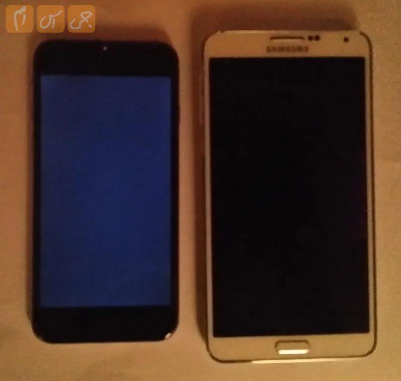 اما تمام این تعریف‌ها باید بگوییم که کیفیت صفحه نمایش رتینای اپل از کیفیت صفحه نمایش گلکسی اس 5 و یا گلکسی نوت 3 پایین‌تر است. دلیل این ادعا هم به نوع صفحه نمایش دو گوشی باز می‌گردد، صفحه نمایش گلکسی نوت 3 سامسونگ، سوپر آمولد و صفحه نمایش آیفون 6، ال سی دی است. عمق رنگ مشکی در صفحه نمایش‌های سوپر آمولد بسیار بیشتر از عمق رنگ مشکی در صفحه نمایش‌های LCD است. ما دو فیلم کاملا تاریک را بر روی گلکسی نوت 3 (در سمت راست تصویر) و آیفون 6 پخش کرده و در محیط تاریک از این دو صفحه نمایش عکس گرفتیم، همانطور که مشاهده می‌کنید صفحه نمایش گلکسی نوت 3 کاملا مشکی است در حالی که صفحه نمایش آیفون 6 کاملا مشکی نیست، این موضوع به این خاطر ایجاد شده که صفحه نمایش‌های سوپر آمولد عمق رنگ مشکی بسیار خوبی دارند.