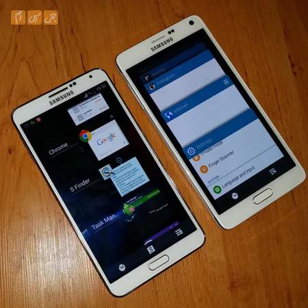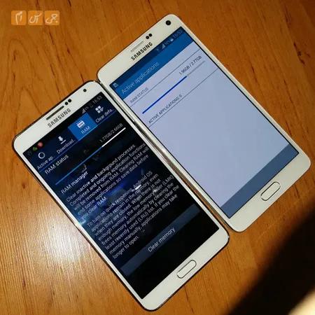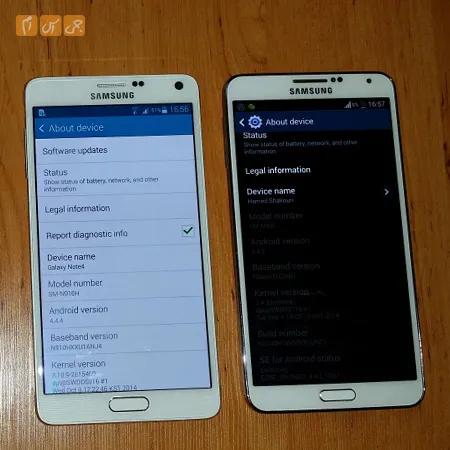 اما در مورد مقایسه نسخههای هشت هستهای این دوگوشی باید گفت برخلاف Exynos 5420 در Exynos 5433 هر هشت هسته بهصورت همزمان پردازش میکنند و شاهد یک پردازنده واقعی 64 بیتی هستیم. به علت عدم پشتیبانی سیستمعامل این گوشی یعنی کیت کت از پردازنده 64 بیتی، نسخه 8 هستهای Note 4 روی کارکرد 32 بیتی تنظیمشده است نکته دیگر اینکه نرمافزارهای 64 بیتی هنوز ارائه نشدهاند. علاوه بر این پردازندههای 64 بیتی با گوشیهای دارای RAM چهار گیگابایت به بالا، قدرت خودشان را نشان میدهند حال اینکه Note4 مانند Note3 دارای 3 گیگابایت حافظه RAM است.