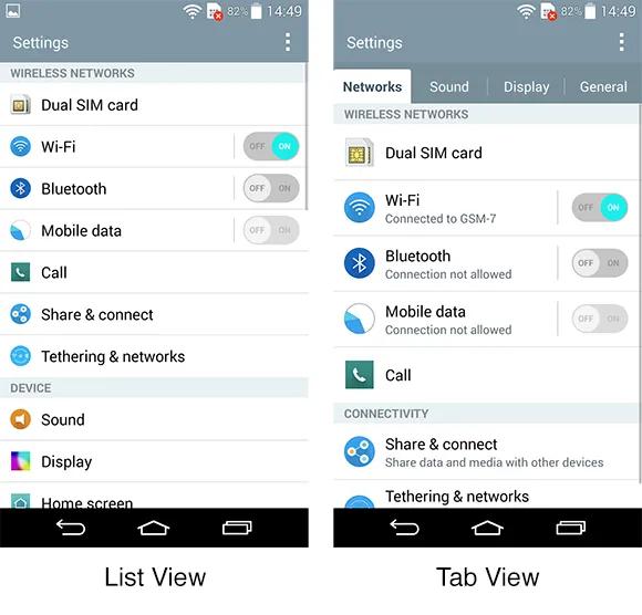 اما به محضی که وارد بخش تنظیمات این گوشی می شوید، باز هم ممکن است نا امید شوید اما خوشبختانه یک گزینه برای تبدیل نمایش تنظیمات گوشی از حالت Tab View به List View دارد و در نتیجه تنظیمات گوشی تبدیل به حالت تنظیمت عادی اندروید می شود. اما این مورد هم می توان گفت به نوعی سلیقه ای است و ال جی با ساخت این رابط کاربری، سعی در جذب طیف وسیعی از کاربران را داشته است.