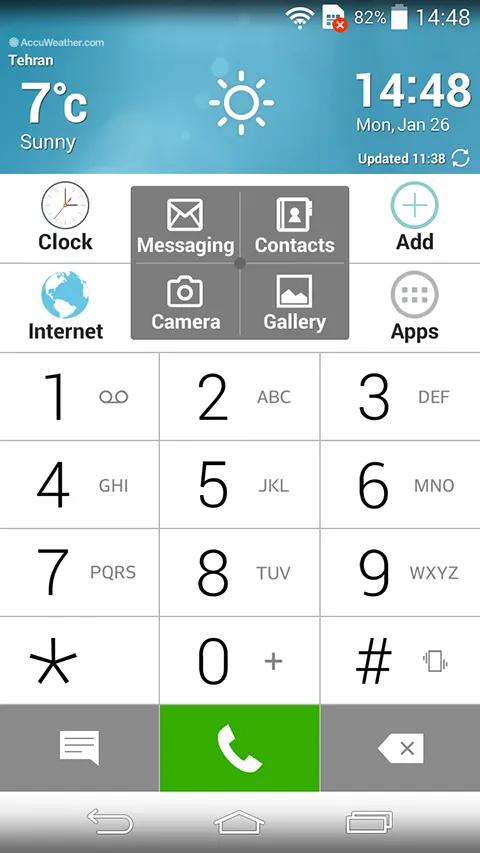 البته ال جی علاوه بر لانچر اصلی خود، یک لانچر ساده تر به نام Easy Phone هم در این رابط کاربری قرار داده است. این لانچر ساده در حالت عادی صفحه کلید تلفن را نشان می دهد. اما با کشیدن صفحه خانه به سمت چپ، می توانید آیکون های مورد علاقه خود را نیز اضافه کنید.