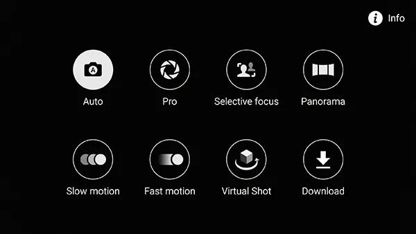 از گزینه های فیلم برداری این دوربین بگذریم به گزینه های عکاسی می رسیم. عکاسی در حالت های Pro، اتوماتیک، Selective Focus و Virtual Shot وجود دارد. حالت Pro مخصوص عکاسان حرفه ای است که قبل از شکار یک صحنه، تنظیمات ISO، نور و فوکوس را به صورت دستی تنظیم می کنند و حالت Auto نیز برای کاربران عادی است. در بخش Pro همچنین می توانید تنظیمات اعمال شده را ذخیره کنید تا دفعات دیگر راحت تر با این حالت عکاسی کنید.