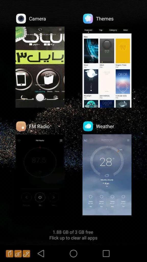 ویژگی بعدی فهرست برنامه‌های باز است. با فشردن کلید مربعی‌شکلی که پایین صفحه در سمت راست قرار دارد، می‌توانید برنامه‌هایی را ببینید که در پس‌زمینه بازند و رم را اشغال کرده‌اند. امکان بستن تک‌تک برنامه‌ها وجود دارد، اما اگر تمایل داشته باشید همه برنامه‌ها را یک‌جا ببندید، با کشیدن صفحه به سمت بالا آیکون سطل آشغال را می‌بینید و با رها کردن صفحه تمام برنامه‌های باز بسته می‌شوند.