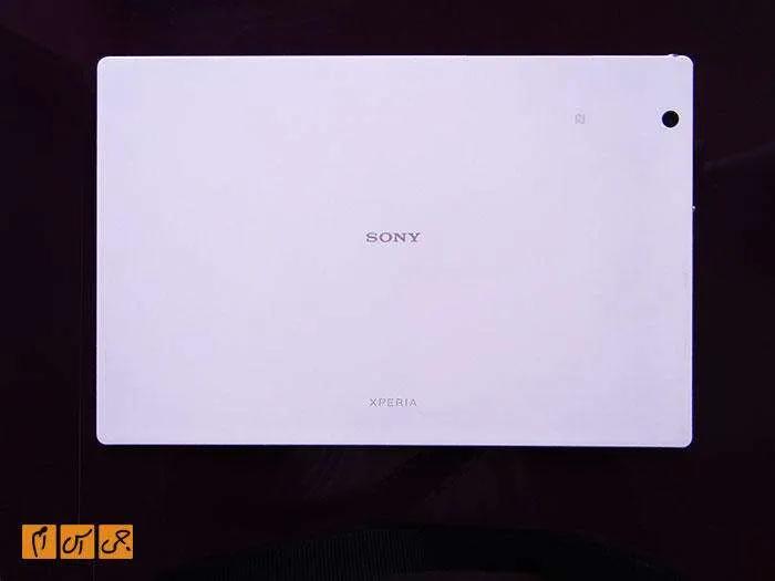 بالای تبلت جک 3.5 میلیمتری صدا و درگاههای سیمکارت و کارت حافظه خارجی قرار دارند. پایین دستگاه هیچ گزینهای قرار نگرفته و درگاه شارژ نیز در سمت راست جای گرفته است. قرار گرفتن درگاه شارژ در این قسمت باعث میشود هنگامی که همزمان به استفاده از تبلت و شارژ کردن آن نیاز داشته باشید، بدون اینکه کابل شارژ مزاحمتی برایتان ایجاد کند، بتوانید با دستگاه کار کنید. قاب پشتی دستگاه، که یکی از زیباترین قسمتهاست، طراحی بسیار سادهای دارد. در این قاب میتوانید لوگوی سونی را در وسط و نام Xperia را در پایین مشاهده کنید. دوربین در سمت راست قرار دارد و از فلاش خبری نیست. محل قرارگیری دوربین کمی تعجبآور است، چون سونی آن را به کنار سمت راست نزدیک کرده و از بالای دستگاه فاصله داده است.