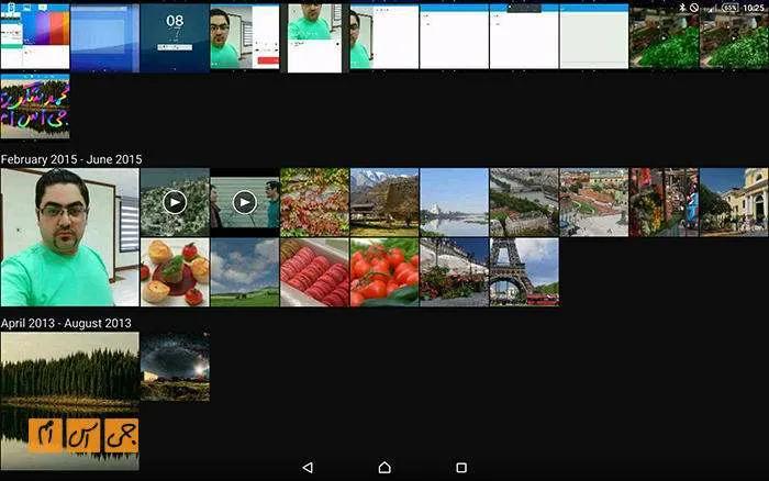 برنامه گالری در این تبلت مانند دیگر محصولات سونی است: یک پیشنمایش بزرگ از عکسها بالای صفحه گالری نمایش داده میشود و عکسهای دیگر در اندازه کوچکتر در ادامه نشان داده میشوند. با دو انگشت و پینچ زوم میتوانید اندازه این عکسهای کوچک را تغییر دهید و آنها را بزرگتر یا کوچکتر کنید. دستهبندی در برنامه گالری بهخوبی و براساس تاریخ انجام میشود.
