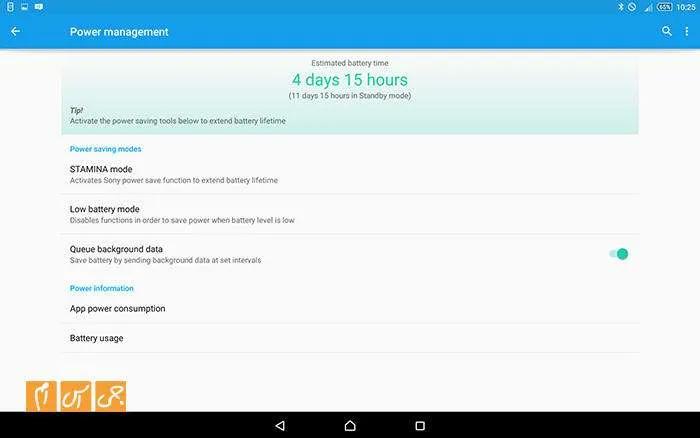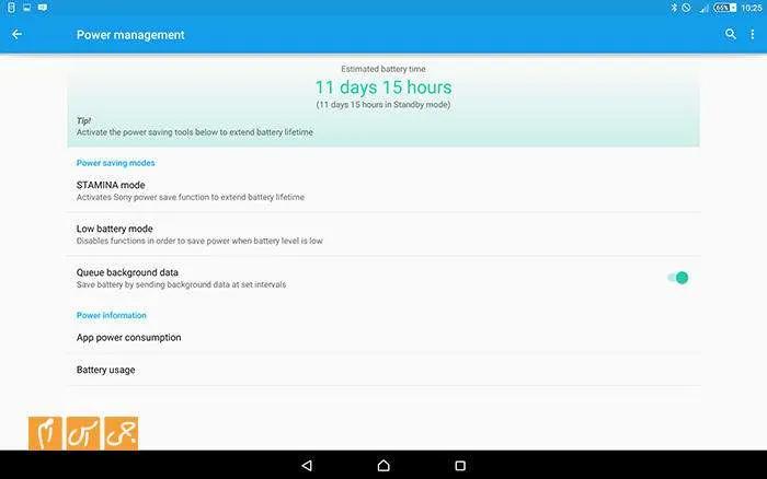 باتری این تبلت ظرفیت 6000 میلیآمپرساعتی دارد. باتری محصولات سونی همیشه عمر قابل قبولی داشتهاند و دارند. در این تبلت و در تستی که ما انجام دادیم، با پخش ویدئوی Full HD به مدت 90 دقیقه، روشنایی 100 درصد صفحه و وایفای روشن میزان باتری از 100 درصد به 80 درصد رسید. این نشان میدهد که با همین روند حدود 8 تا 9 ساعت میتوان بیوقفه با تبلت فیلم تماشا کرد بدون اینکه به شارژ کردنش نیاز داشته باشید. در استفاده ترکیبی، بدون هیچ مشکلی، تا 2 روز میتوانید با تبلت کار کنید و به شارژ نیاز نداشته باشید. البته همهچیز به نوع استفاده شما از تبلت بستگی دارد. کاربرانی که از تبلت استفاده سنگینتری میکنند و بهخصوص با آن زیاد صحبت میکنند برای استفاده از دستگاهشان باید هر روز شارژش کنند. البته با استفاده از ویژگیای به نام Stamina Mode هم میتوانید عمر باتری تبلت را از آنچه هست بیشتر کنید.