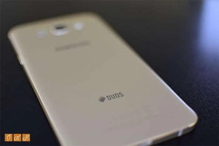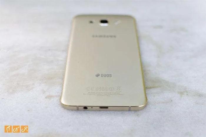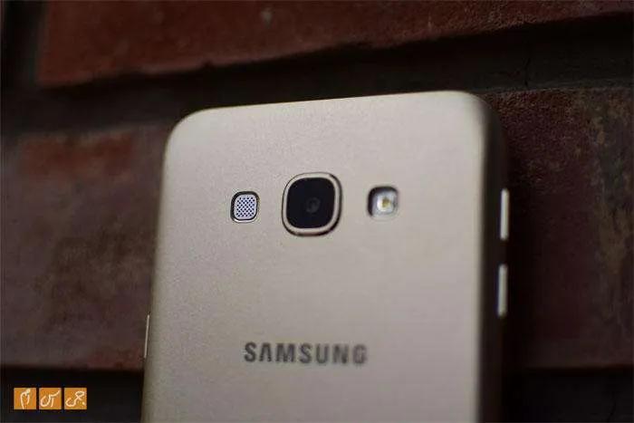پشت دستگاه شاید شما را نخست یاد پرچمدار سامسونگ در سال ۲۰۱۲، یعنی گلکسی اس۳، بیندازد. درحقیقت تمام چهار گوشی خانواده Galaxy A برای جایگیری دوربین، فلاش LED و بلندگو از الگوی مشابه گلکسی اس۳ استفاده کردهاند. زیر این مجموعه سهتایی لوگوی سامسونگ را و پایینتر هم نوشتههای معمول پشت گوشیهای با بدنه یکپارچه را شاهدیم. همچنین عبارت Duos در بخش پایینی نوشته شده است که به دوسیمکارته بودن این گوشی اشاره میکند.
