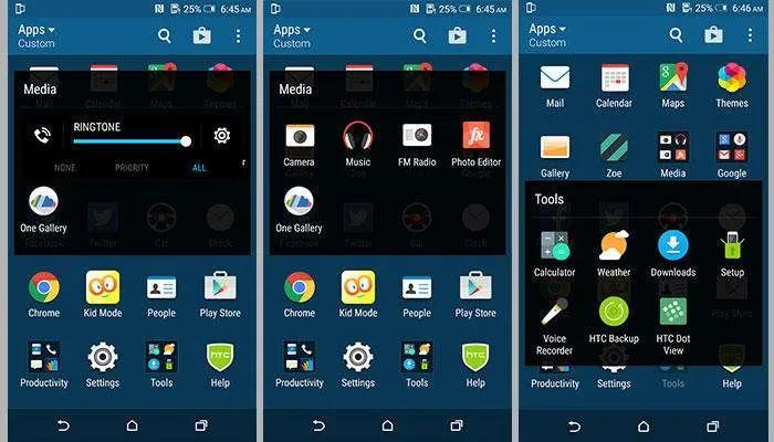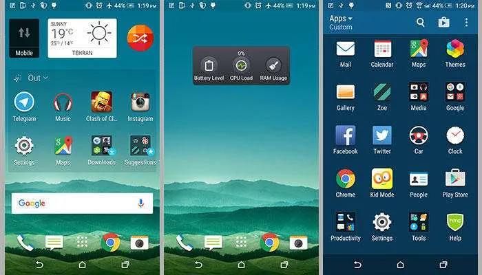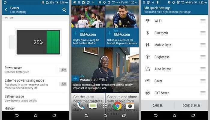 در صفحه اصلی گوشی ویجت اچتیسی سنس به چشم میخورد که اپهای محبوب شما را در کنار پوشه دانلودها و پیشنهادات قرار میدهد؛ البته میتوانید سه حالت مختلف برای این ویجت در نظر بگیرید. حالت بیرون از منزل، کار و خانه سه حالتی هستند که میتوانید متناسب با هریک اپلیکیشنها را بچینید تا به آنها در سریعترین زمان ممکن دسترسی پیدا کنید. در این ویجت قسمتی تحت عنوان پیشنهادات وجود دارد که اپهایی را به شما پیشنهاد میکند که شاید بتوان فان فیت (Fun Fit)، اپلیکیشن سلامتی اچتیسی، را بهترین گزینه پیشنهادی این شرکت دانست. در صفحه سمت چپ هوم نیز بلینک فید (خبرخوان) قرار دارد که با استفاده از آن میتوانید در جریان جدیدترین اخبار روزانه قرار بگیرید و آنها را مطالعه کنید. قسمت اپهای اخیر (Recent Apps)، که تمام اپلیکیشنهای درحال اجرا روی سیستم را نمایش میدهد، طراحی بسیار جذابی دارد و دارای گزینهای برای بستن تمام اپهاست. البته بهتر بود این دکمه پایین صفحه قرار میگرفت تا استفاده از آن حین حرکت راحتتر میشد.