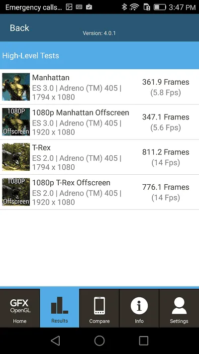 پردازنده گرافیکی بهکاررفته در این گوشی آدرنو 405 است که ما آن را با آزمون GFX OpenGL آزمودیم و نتایج زیر به دست آمد.