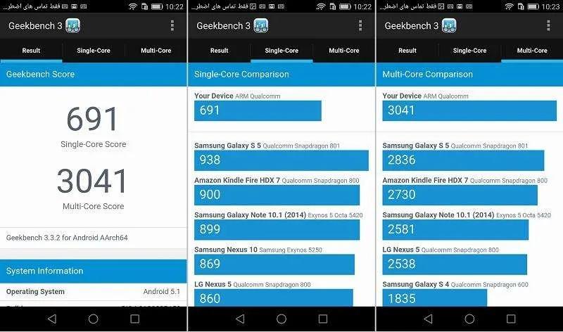 ما روی این گوشی تست GeekBench را انجام دادیم که در حالت تکهسته امتیاز 691 و در حالت چندهسته امتیاز 3041 را به خود اختصاص داد. این امتیاز نسبت به گوشیهایی همچون Z5، با امتیاز تکهسته 1325 و چندهسته 4446، که از پردازنده اسنپدراگون 810 در کنار 3 گیگابایت حافظه رم استفاده میکند کمتر است.