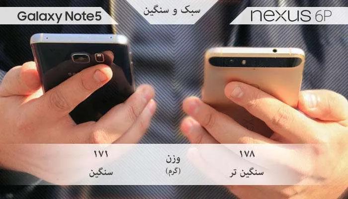 هر دو گوشی وزن نسبتا زیادی دارند، اما خب! نوت 5 کمی از نکسوس 6پی سبکتر است، هرچند این سبک بودن چندان حس نمیشود.