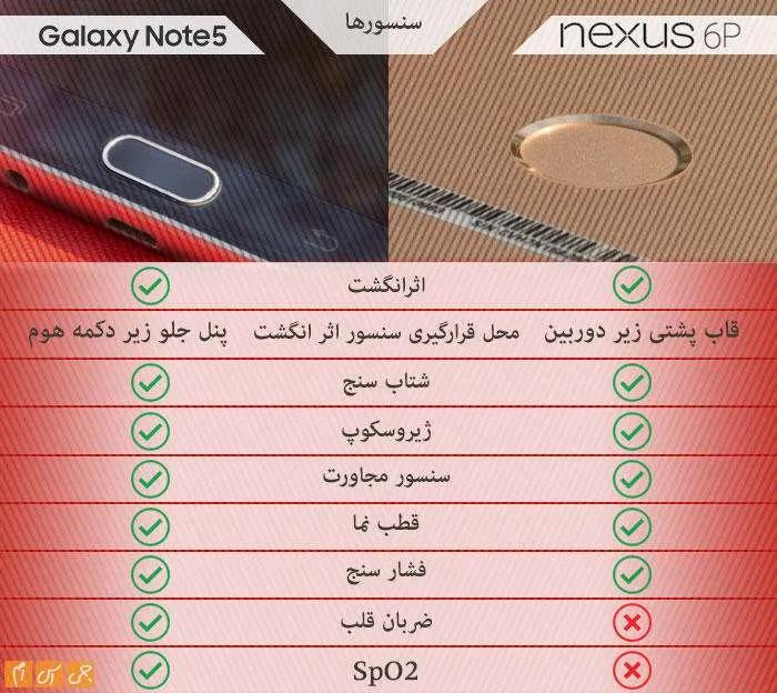 اسکنر اثر انگشت قطعهای بود که در اکثر پرچمداران 2015 دیده شد. نوت 5 و نکسوس 6پی نیز به این قطعه مجهزند و بالاترین سطح امنیت را به کاربران هدیه میدهند. محل قرارگیری سنسور اثر انگشت هر دو محصول خوب است، اما باید بگوییم محل قرارگیری سنسور نوت 5 بهتر است. سنسور SpO2 سنسوری است که میتواند میزان اکسیژن موجود در خون را اندازهگیری کند. نوت 4 نیز چنین سنسوری درون خود داشت.