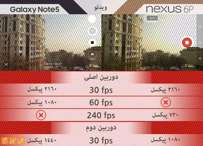 اگر به ضبط ویدئو علاقه دارید، خوب است بدانید هر دو محصول ویدئوهای باکیفیتی ارائه میدهند، ولی این نکته را در ذهن داشته باشید: کیفیت ویدئوهای دوربین دوم نوت 5 بهتر از نکسوس 6پی است.