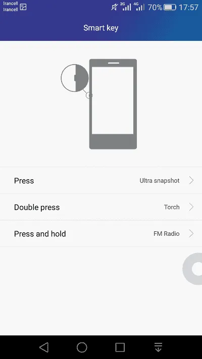 برای اولین بار شاهد کلیدی اضافی در این قسمتیم. هوآوی این کلید را Smart Key نامیده است. در تنظیمات گوشی میتوانید وظایف خاصی به این کلید بسپارید. بهطور مثال، میتوانید تنظیم کنید با یک بار فشردن این کلید دوربین شروع به کار کند و با دو بار فشردن آن اسکرینشات گرفته شود و با فشار مداوم آن نرمافزار موردنظرتان اجرا شود؛ درواقع این کلید سهحالته است.