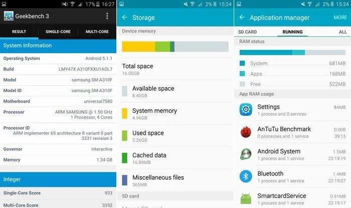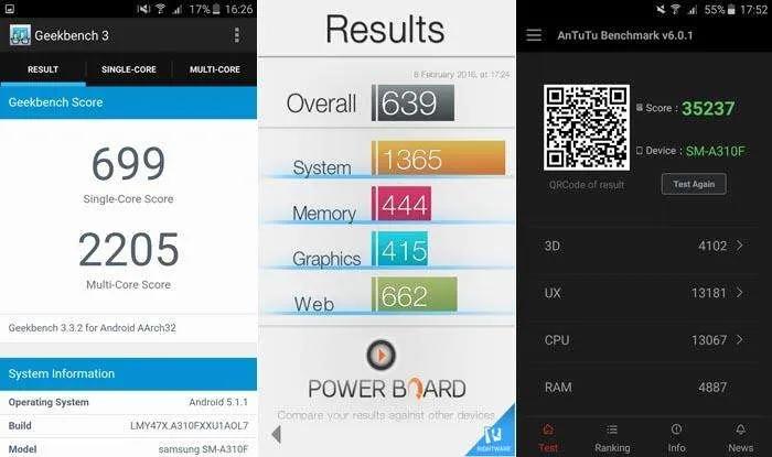 در ادامه میتوانید نتایج تستهای سختافزاری (Galaxy A3 (2016 را مشاهده کنید.