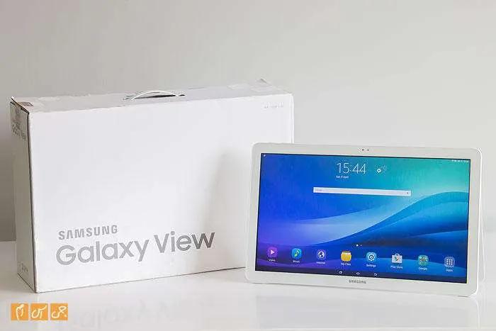در ابتدا که جعبه محصول را دیدیم، تصور کردیم که یک مانیتور برایمان فرستاده شده است، اما وقتی نام Galaxy View را روی آن دیدیم، متوجه شدیم که محصولی اندرویدی پیش روی خود داریم. بسته محصول شامل یک جعبه بزرگ است که داخل آن یک گلکسی ویو و یک شارژر قرار دارد. شارژر محصول با آنچه در بسته‌بندی گوشی‌ها و تبلت‌ها مشاهده می‌کنید متفاوت است و به شارژر لپ‌تاپ‌ها شباهت دارد.