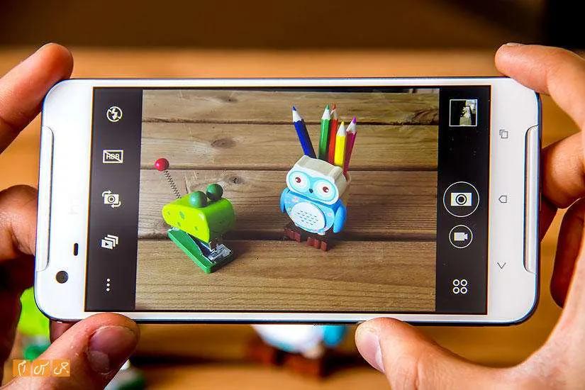 سرعت بالا آمدن دوربین در حد قابل قبولی است و به شما اطمینان می‌دهیم که هیچ صحنه‌ای از دست نخواهید داد. با فعال کردن دوربین رابط نرم‌افزاری آشنای اچ‌تی‌سی فعال می‌شود. در این رابط نرم‌افزاری بالای صفحه 5 گزینه برای دسترسی سریع کاربر به تنظیمات قرار دارد و در پایین نیز دو کلید برای عکاسی و فیلم گرفتن دیده می‌شود. گزینه‌های متفاوت برای عکس‌برداری در منوی جداگانه‌ای قرار گرفته که با کشیدن انگشت خود به چپ یا راست می‌توانید آنها را انتخاب کنید.