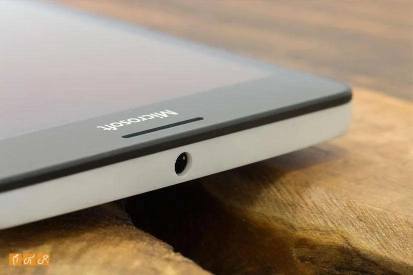 در جلو قاب شیشهای صفحهنمایش 5.7 اینچی حدود 75 درصد فضا را به خود اختصاص داده است. حاشیههای کناری صفحهنمایش در مقایسه با گوشیهای پرچمدار اندرویدی بسیار زیاد است، اما در بالا و پایین بین حاشیههای این گوشی تفاوتی با رقبا دیده نمیشود. زیر صفحهنمایش میکروفون اصلی روی قاب شیشهای صفحهنمایش دیده میشود و بالای صفحه نیز شاهد حضور دوربین دوم در انتهای کناری سمت راست، خروجی صدای مخاطب و نام مایکروسافت هستیم.