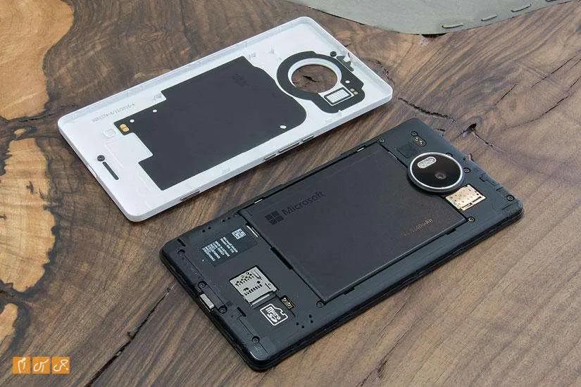 در قاب پشتی لنز بزرگ دوربین کنار فلاش 3 تایی در محوطهای جداشده از قاب قرار دارد. این لنز، طبق نوشته زیر آن، محصول کارخانه مشهور زایس است. در سمت چپ دوربین اسپیکر قرار دارد.NFC نیز درون قاب و در همین قسمت قرار گرفته، درحالیکه محل قرارگیری شارژ بدون سیم در وسط قاب پشتی است. در بخش بالایی و پایینی قاب پشتی 5 سوراخ دیده میشود که میکروفونهای دستگاه برای ضبط صدا هنگام فیلمبرداری هستند. وسط قاب پشتی نیز لوگوی زیبای مایکروسافت با جنسی از فلز خودنمایی میکند.