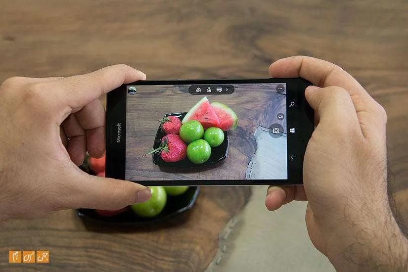 مایکروسافت بسیار سعی کرده تا در این بخش از رقبای خودش عقب نماند، اما به نظر ما بهخوبی از این سعی خود نتیجه نگرفته است. منوی دوربین بسیار ساده و کمامکانات است. در سمت راست دو کلید مخصوص برای گرفتن عکس و فیلمبرداری و در بالای صفحه سوئیچ تنظیم HDR، فلاش و فعال کردن دوربین دوم قرار دارد. تنظیم کاربردیای در منوی دوربین دیده نمیشود و از امکانات فراوان منوی دوربینهای سامسونگ، الجی یا اچتیسی در اینجا خبری نیست.
