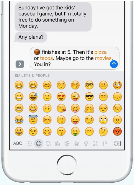 برنامه مسیج، که پرکاربردترین بخش در آیفون است، نیز تغییرات خوبی در خود دارد. اموجی ها در برنامه مسیج 3 برابر بزرگ‌تر شده‌اند. ویدئوها درست در همان خطی پخش می‌شوند که مسیج فرستاده شده. تشخیص اموجی متناسب با کلمه‌ای که تایپ کرده‌اید نیز به این برنامه افزوده شده است.