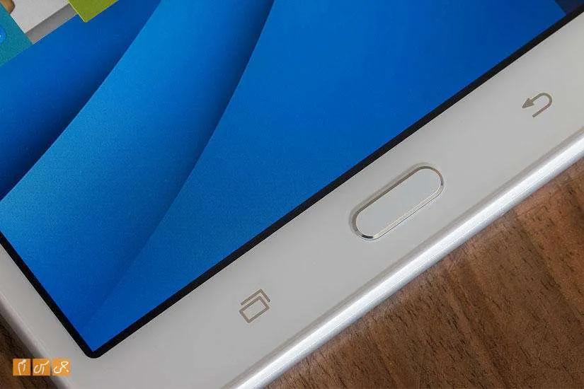از روبرو شباهت بسیاری بین این تبلت و گوشیهای سامسونگ وجود دارد. پایین صفحهنمایش سه کلید معروف سامسونگ را میبینیم و بالای صفحه خروجی صدای مخاطب در کنار دوربین دوم جای گرفته است.