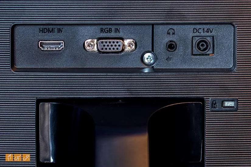 اکنون که به قاب پشت مانیتور رسیدیم، اجازه دهید در مورد آن هم کمی صحبت کنیم. در قاب پشتی، که شیار دارد، تورفتگیای میبینید که راههای ارتباطی مانیتور هستند. این مانیتور به یک درگاه ورودی HDMI، یک درگاه ورودی RGB، یک خروجی هدفون و یک ورودی DC برای اتصال به برق مجهز است. هیچ اسپیکری روی مانیتور وجود ندارد، اما با کمک خروجی هدفون، که همان جک 3.5 میلیمتری صداست، میتوانید اسپیکرهای خارجی را به آن متصل کنید. کلید روشن و خاموش و رفتن به تنظیمات را هم در پشت و سمت چپ قاب پشتی مشاهده میکنید.