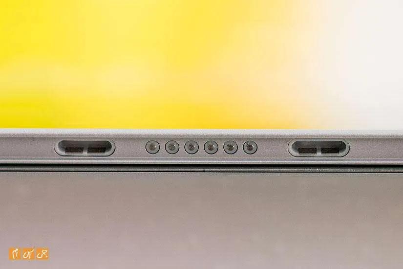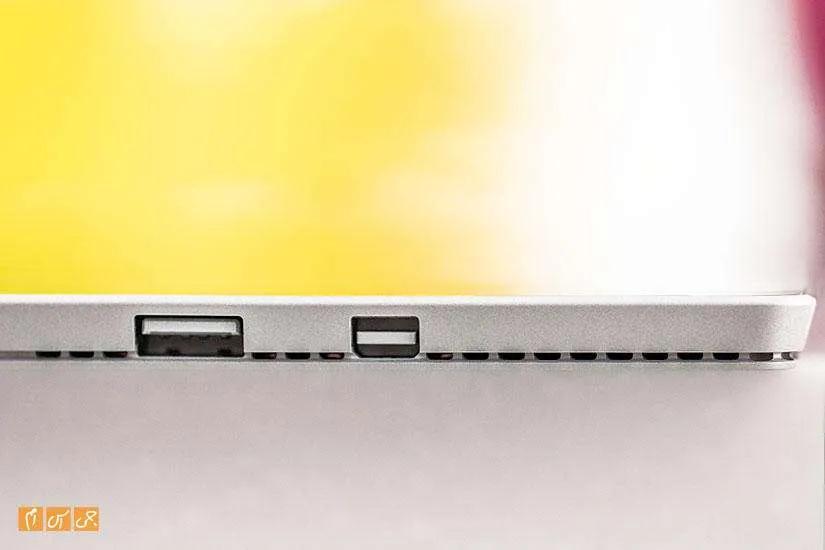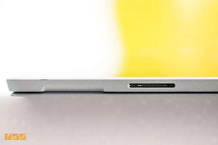 درگاههای ارتباطی این تبلت کاملاند و نیاز هر کاربری را برطرف میکنند. درگاه USB 3.0 و Mini Display در لبه سمت راست کنار درگاه شارژ قرار گرفتهاند. لبه سمت چپ محل قرارگیری قلم است. بالای جایی که قلم وصل میشود سوکت جک 3.5 میلیمتری هدفون را مشاهده میکنید. لبه پایینی هم درگاه ارتباطی داک و محل اتصال صفحهکلید است. این طرز قرارگیری درگاهها در حالتی است که تبلت روی میز قرار گرفته و به پایهاش تکیه کرده باشد.