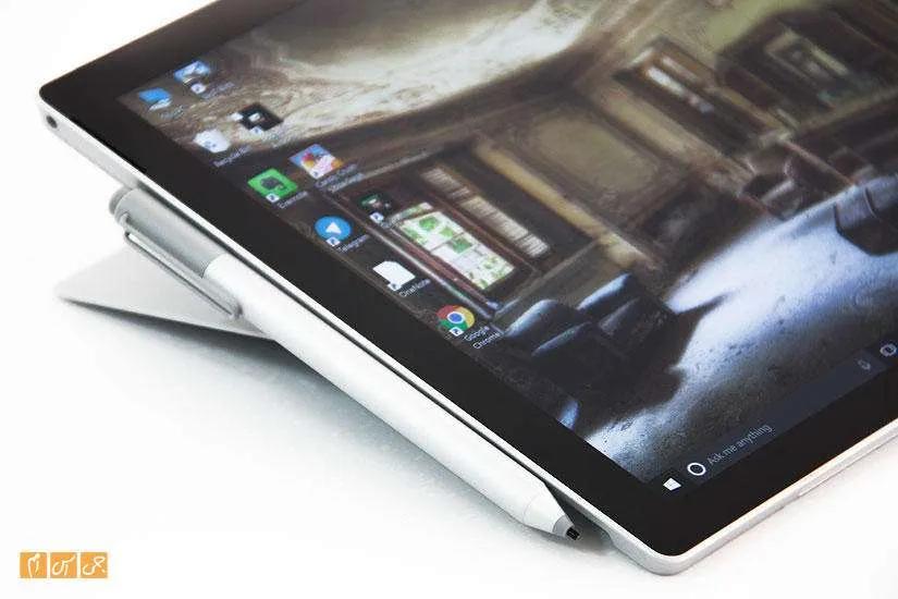 همانطور که گفتیم محل اتصال قلم لبه سمت چپ دستگاه است. در این محل آهنربایی قرار گرفته است که قلم با کمک نیروی مغناطیس به آن و به بدنه میچسبد. ابعاد قلم تقریبا شبیه خودکارهای معمولی است، اما وزن بیشتری دارد. این وزن زیاد به جنس بدنه فلزیاش برمیگردد. قلم گیرهای دارد که برای قرار دادنش در جیب استفاده میشود. پایینش نوک دارد و بالایش پاککن. با استفاده از نوک میتوانید روی صفحهنمایش ضربه بزنید یا چیزی بنویسید یا نقاشی کنید. با استفاده از پاککن (در برخی برنامههای خاص) میتوانید همهچیز را پاک کنید. پاککن فشاری است و با فشارش برنامه One Note بازمیشود.