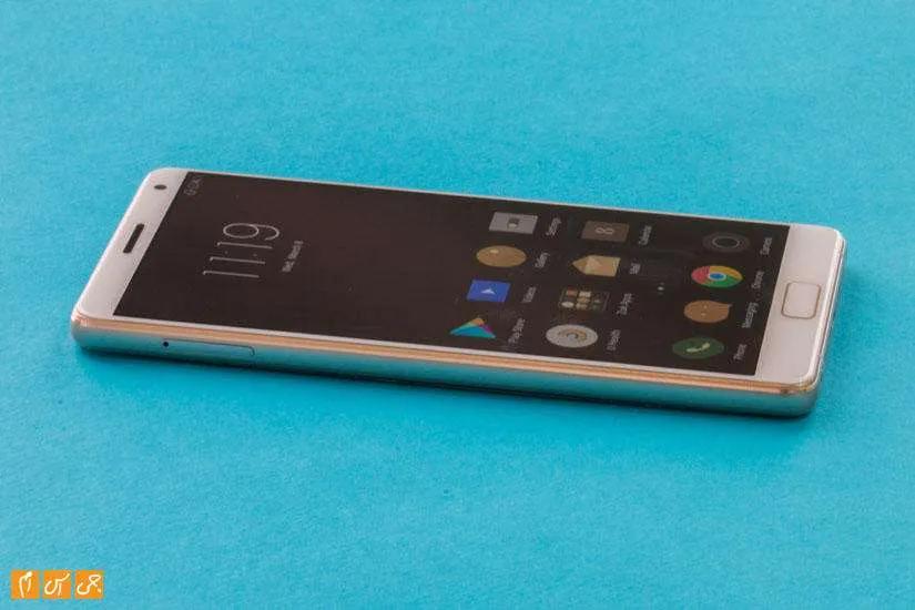 اولین چیزی که با نگاه به گوشی نظر را جلب میکند حاشیههای بسیار کم صفحهنمایش است. صفحهنمایشی 5.5 اینچی 80 درصد قاب جلو را به خودش اختصاص داده است. نه در کنارهها فاصله صفحهنمایش با قاب دستگاه خیلی کم است بالا و پایین هم حاشیههای کمی برای صفحهنمایش در نظر گرفتهشده. یکی از بخشهایی که در طراحی قاب جلویی دوست نداریم یکسان نبودن حاشیه بالا با حاشیه پایین صفحهنمایش است این موضوع باعث شده باوجود حاشیههای کم قاب جلویی طراحی خیلی گیرایی نداشته باشد. بالای صفحهنمایش دوربین دوم سمت راست و خروجی صدای مخاطب وسط قرارگرفتهاند. پایین صفحهنمایش کلیدی لمسی و مستطیلی شکل دیده میشود که وجود همین کلید سبب شده تا اندازه حاشیههای بالا و پایین یکسان نباشند.