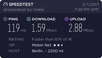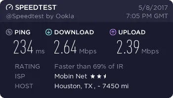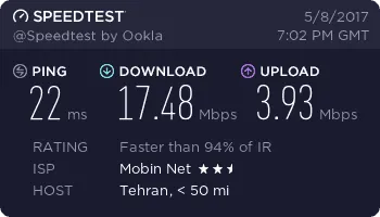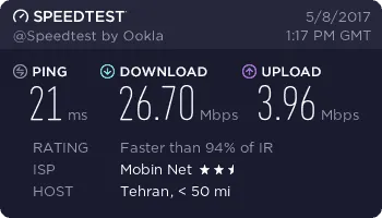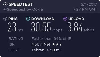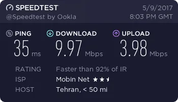سرعت 40 مگ گفتن ولی من اجارم 3 جا عوض کردم از مرکز شهر تا پایینو متوسطو غیره خونه دوستامم زدم بالای 15 مگابیت بزور میره نهایت سرعت در گرگان 20 مگابیته بهرحال همین سرعتم از adsl هایی که با اسم 16 مگابیت فیک میدن خوبه البته من یه ساله خریدم سرعتش هر سال بهتر میشه فک کنم سال دیگه 23 مگابیت بشه تازه برای بعضی مناسبتا اینترنت مفتی از 1 گیگ تا 10 گیگ میده که کم پیش میاد ولی حجم اضافه ای که برای سرور میخواین بخرین مثلا 200 گیگتون تموم شد گیگی میوفته 3 هزار تومان ! که بنظرم گرونه ولی مبین نت یه چاره گذاشته دستمون واس حجم اضافه