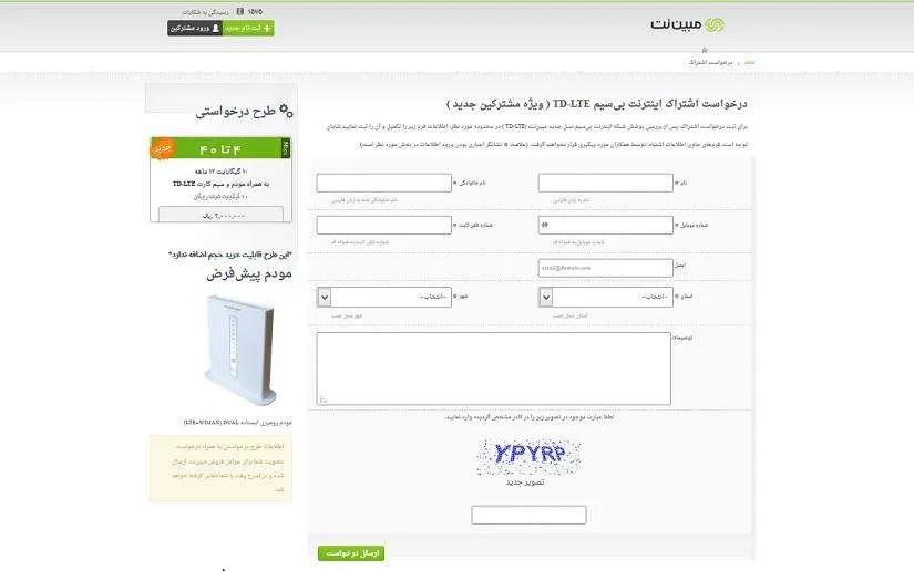 برای بهرهمند شدن از خدمات مودم کافی است به سایت مبین نت بروید و از قسمت “ثبت نام جدید” وارد بخش “ثبت نام اینترنت نسل جدید TD-LTE مبین نت” شوید و فرم ثبت نام را پر کنید. پس از آن کارشناسان مبین نت با شما تماس میگیرند و بر اساس موقعیت مکانی شما، تحت پوشش بودن منطقه شما را چک میکنند. در صورتی که در محدود پوشش شبکه TD-LTE مبین نت باشید ثبتنام اولیه شده انجام میشود و کارشناسان برای نصب مودم مجددا با شما تماس میگیرند.