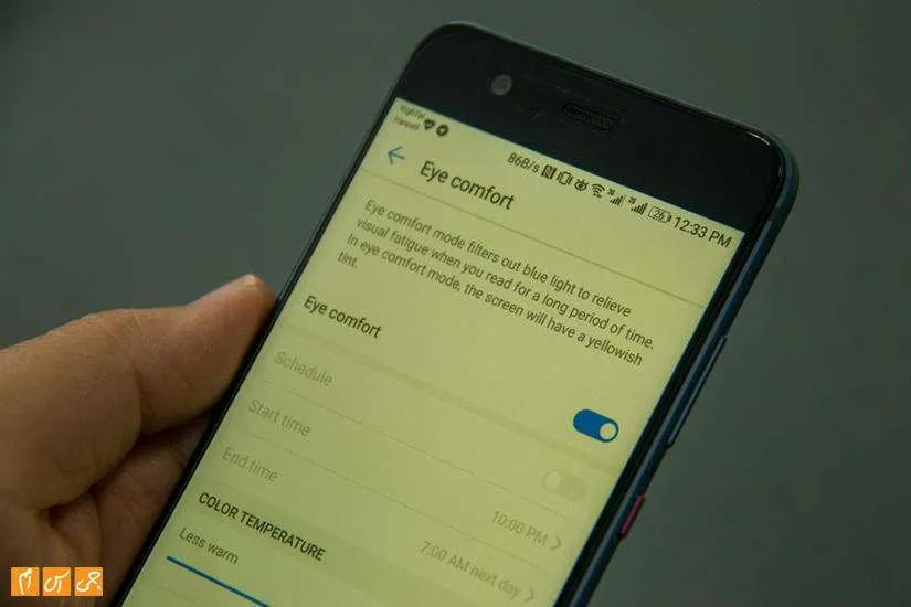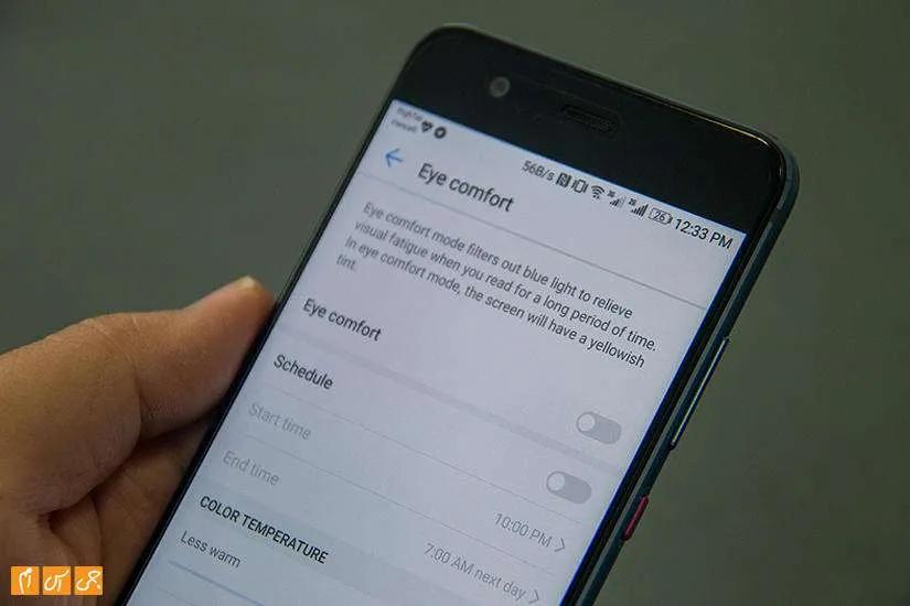 بخشی به نام Eye comfort در تنظیمات صفحهنمایش وجود دارد. با فعال کردن این تنظیم پیکسلهای آبی خاموش و رنگ پیکسلهای زرد روی صفحهنمایش غالب میشود. این تنظیم برای زمانی موثر است که در نور کم قصد کار کردن با گوشی را داشته باشید.