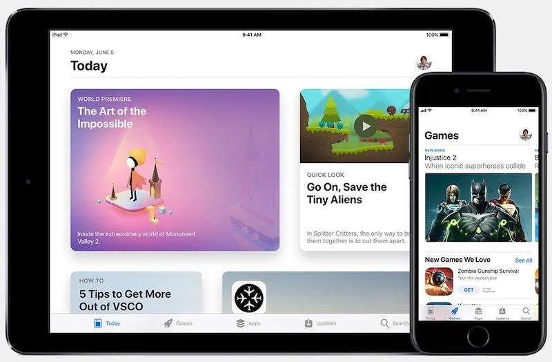 پس از به روز رسانی به آی‌اواس ۱۱ در نگاه اول ممکن است فقط تغییر آیکون AppStore را مشاهده کنید اما پس از این که وارد آن شوید متوجه خواهید شد AppStore به طور کلی تغییر پیدا کرده است. AppStore در ای‌آواس ۱۱ طراحی جدید و جالبی دارد. اپلیکیشن‌ها به صورت کارتی نمایش داده می‌شود. تب Today اپلیکیشن‌های ترند و محبوب سرتاسر دنیا و اخبار مربوط به آن را نمایش می‌دهد. از آن‌ جا که بازی‌ها از محبوبیت زیادی برخوردار هستند تب جداگانه به نام Games در نظر گرفته شده که فقط مختص به نمایش بازی‌ها و اخبار مربوط به آن است.
