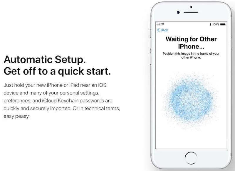 در آی‌او‌اس ۱۱ هنگام راه‌اندازی آیفون می‌توانید تمام تنظیمات شخصی و پسووردهایتان را بسیار راحت‌تر از گذشته از یک آیفون به آیفون دیگر منتقل کنید. این قابلیت روندی مشابه راه‌اندازی اپل واچ با آیفون دارد و برای انجام آن تنها کافی است دوربین آیفونتان را روی صفحه‌نمایش آیفون دیگری نگه دارید تا ارتباط آن‌ها با یکدیگر برقرار شود.