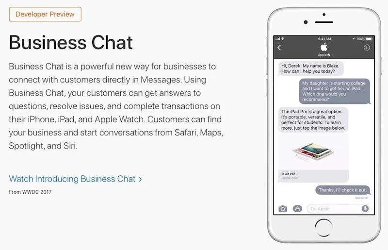 بستری برای ارتباط کمپانی‌ها با مشتریان برقرار شده که Business Chat نام دارد. با استفاده از Business Chat مشتری‌ها می‌توانند سوالات، مشکلات خود را مطرح کنند و پاسخشان را همان جا دریافت کنند. مشتری‌ها نیز می‌توانند با استفاده از آیفون، آیپد و اپل واچ از طریق سافاری، سیری، نقشه اپل و Spotlight به چت تجاری وارد شوند.