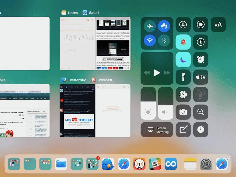 اپ سوییچر جدید آیپد همانند داک شباهت بسیار زیادی به macOS دارد و برنامه‌های در حال اجرا را بسیار زیباتر از گذشته نمایش می‌دهد. مرکز فرمان نیز در آیپد App Switcher ترکیب شده‌اند به صورت یک‌جا نمایش داده می‌شود. که در تصویر زیر می‌توانید مشاهده کنید.