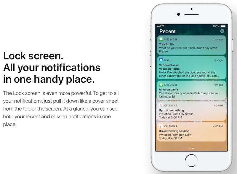 لاک‌اسکرین در آی‌اواس ۱۱ ساده و کاربردی‌تر از گذشته شده است. هم‌اکنون در لاک‌اسکرین با کشیدن انگشتتان به بالا می‌تواند تمام نوتیفیکیشن‌های اخیر و آن‌هایی را که قبلا ندیده‌اید را در یک جا مشاهده کنید و دیگر نیازی نیست به Notification Center مراجعه کنید.