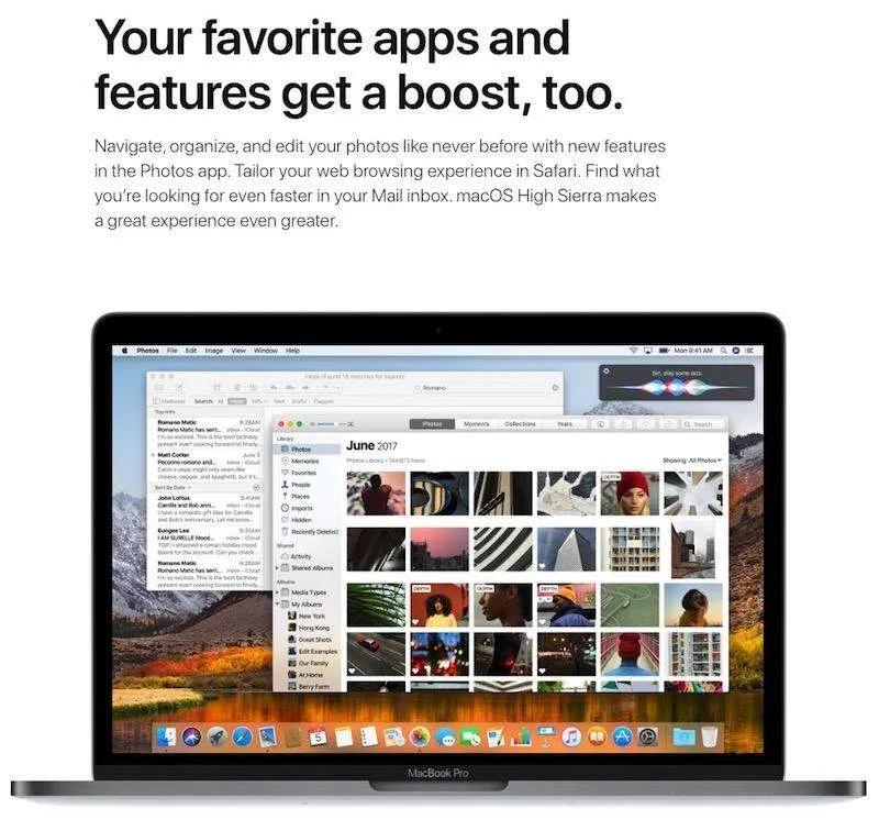 macOS High Sierra ممکن است در نگاه اول تغییر چندانی نسبت به Sierra نداشته باشد اما در هسته سیستم‌عامل بهبود‌هایی ایجاد شده تا کاربران پیش از هر زمان دیگری از نهایت سرعت و عماکرد کامپیوتر مک‌شان بهره‌مند شوند. اپل این طور درباره High Sierra می‌گوید: macOS High Sierra تکنولوژی‌ و فن‌آوری‌های جدیدی را به ارمغان می‌آورد که به قلب مک شما نفوذ کرده و کامپیوتر شما را تواناتر، قابل اعتمادتر و پاسخگو‌تر از گذشته می‌کند و پایه‌ریزی برای نوآوری‌های آینده ایجاد می‌کند تا مک شما از حالا آماده باشد. در macOS High Sierra پالایشی در ویژگی‌ها و برنامه‌هایی که هر روز از آن استفاده می‌کنید شده‌ تا macOS در بالاترین سطح عملکرد و استانداردهایش باشد. در ادامه با چند ویژگی مهم High Sierra آشنا خواهیم شد.